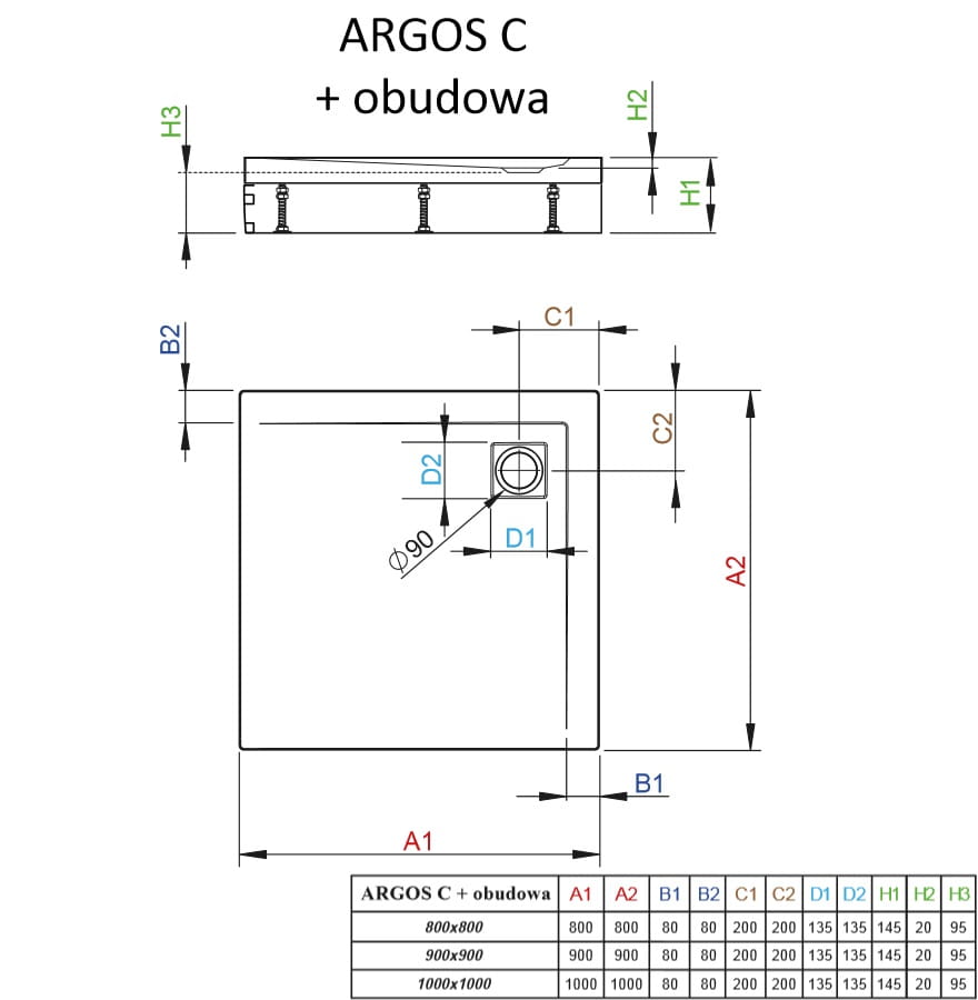 Brodzik kwadratowy z nóżkami Radaway z serii ARGOS C 80 x 80 cm Nr katalogowy: 4ACN88-02