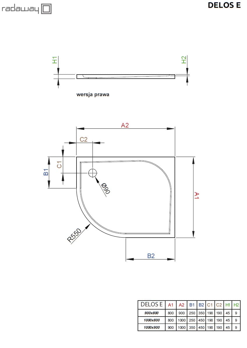 DELOS E 90x80 cm półokrągły asymetryczny brodzik akrylowy prawy SDE8090-01R RADAWAY
