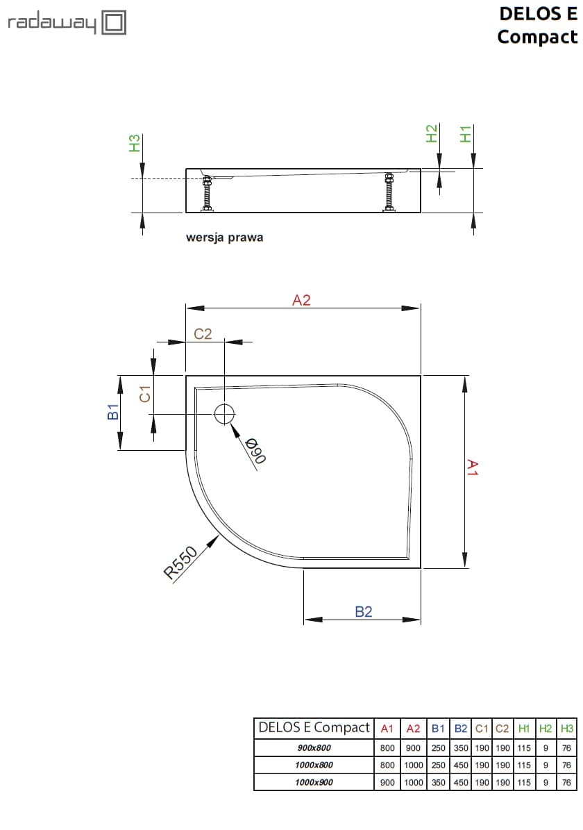 DELOS E Compact 90x80 cm półokrągły asymetryczny brodzik akrylowy prawy SDE9080-05R RADAWAY
