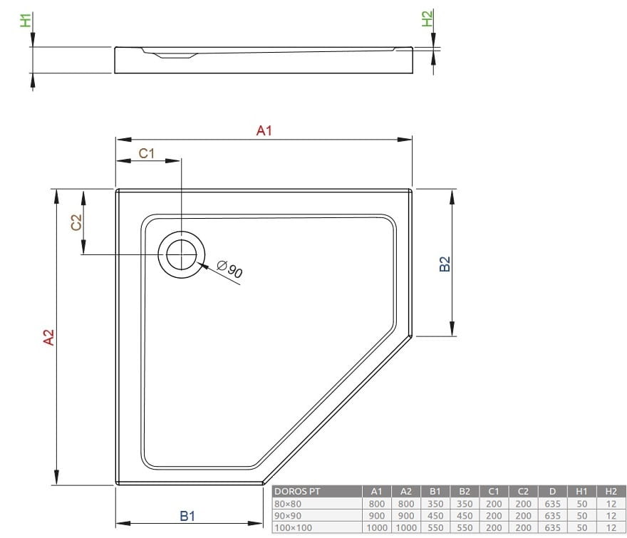 Brodzik pięciokątny akrylowy Radaway z serii DOROS PT 90 x 90 cm Nr katalogowy: SDRPT9090-01