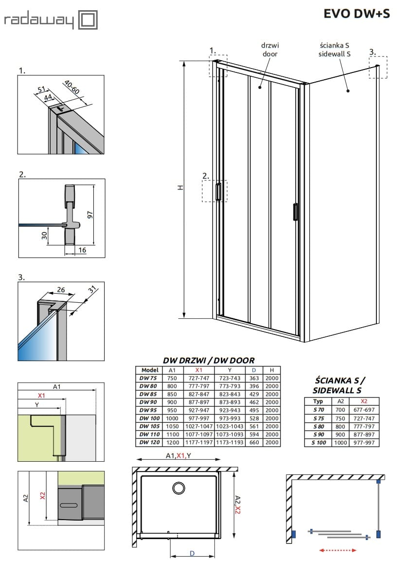 EVO DW+S uniwersalna kabina prysznicowa 100 drzwi x 75 ścianka szkło przejrzyste 335100-01-01+336075-01-01 Radaway
