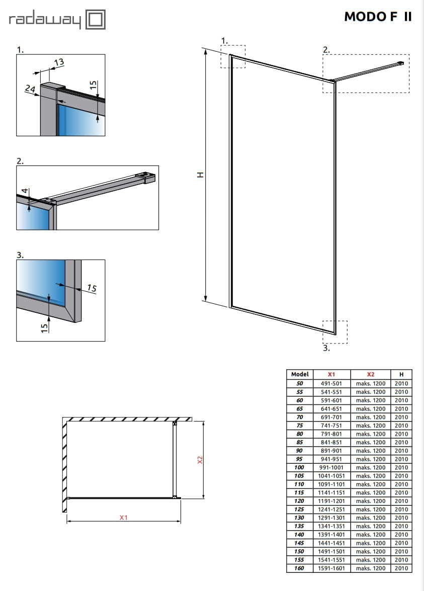 | Nr artykułu | Model | Wymiar nominalny (X1) | Wysokość (H) | Kolor szkła | Kolor profili |