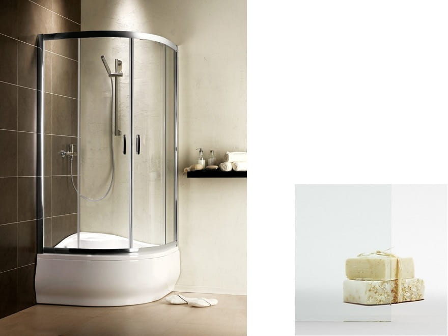 Powłoka ochronna ułatwiająca czyszczenie kabiny prysznicowej. Dzięki właściwościom hydrofobowym powłoki krople wody nie utrzymują się na powierzchni szkła, tylko spływają, nie pozostawiając osadów.